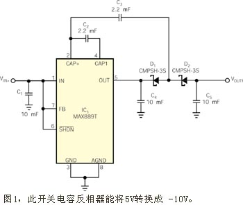 典型开关式电容器充电泵不需要电感器,因此容易设计,且能将正电压加倍及将正电压转换成一个等效负电压。但在某些应用中,只有正电源可用,且电源系统必须产生一个幅度比正电源电压幅度更大的负电压。图1所示电路可将其输入电压反相的同时将所得负电压加倍。