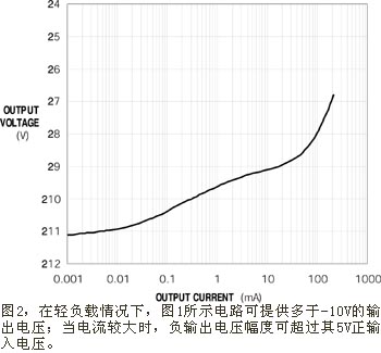 通常,MAX889T电压反相器IC1可将一个正输入电压转换成一个绝对幅度低于其输入值的负输出电压。但此电路中,肖特基二极管D1、D2及电容器C4与C5可帮助产生一个更高的输出电压。该电路的额定输出为VOUT=-(2×VIN-2VD-IOUT×RO),其中,VIN为输入电压,VD为二极管正向压降,IOUT为输出电流,RO为IC1在自由运行模式下的输出电阻。对于300mA的负载电流来说,该电路输出电压为 -10V。电容器及印制电路板走线中的寄生电感可产生为输出电容器充电的电压过冲,从而在无负载情况下提供多于-10V的输出电压(图2)。